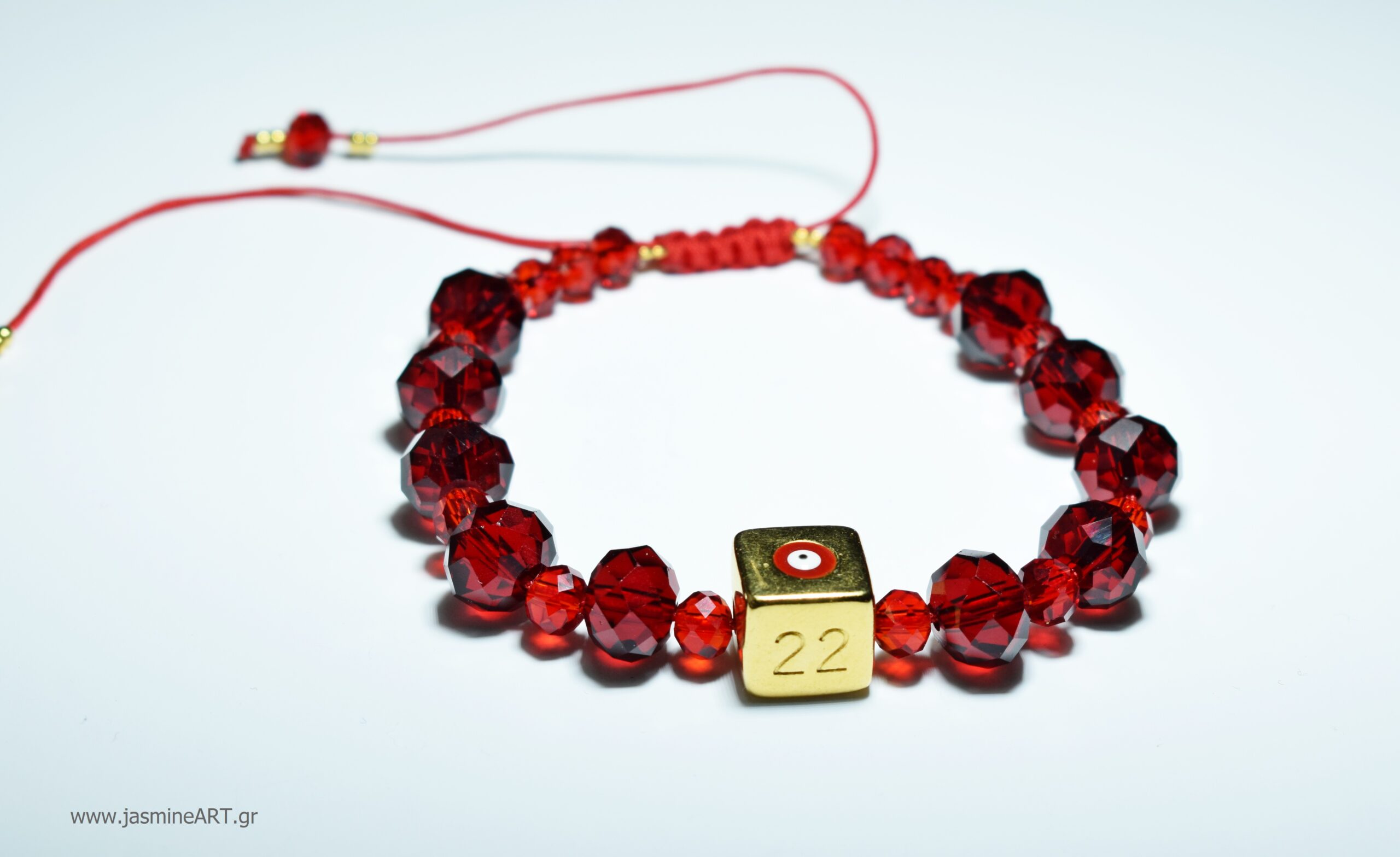 Εντυπωσιακό βραχιόλι γούρι με επίχρυσο στοιχείο ζάρι και κόκκινα κρυσταλλάκια με μακραμέ δέσιμο για να αυξομειώνεται το μέγεθος του.