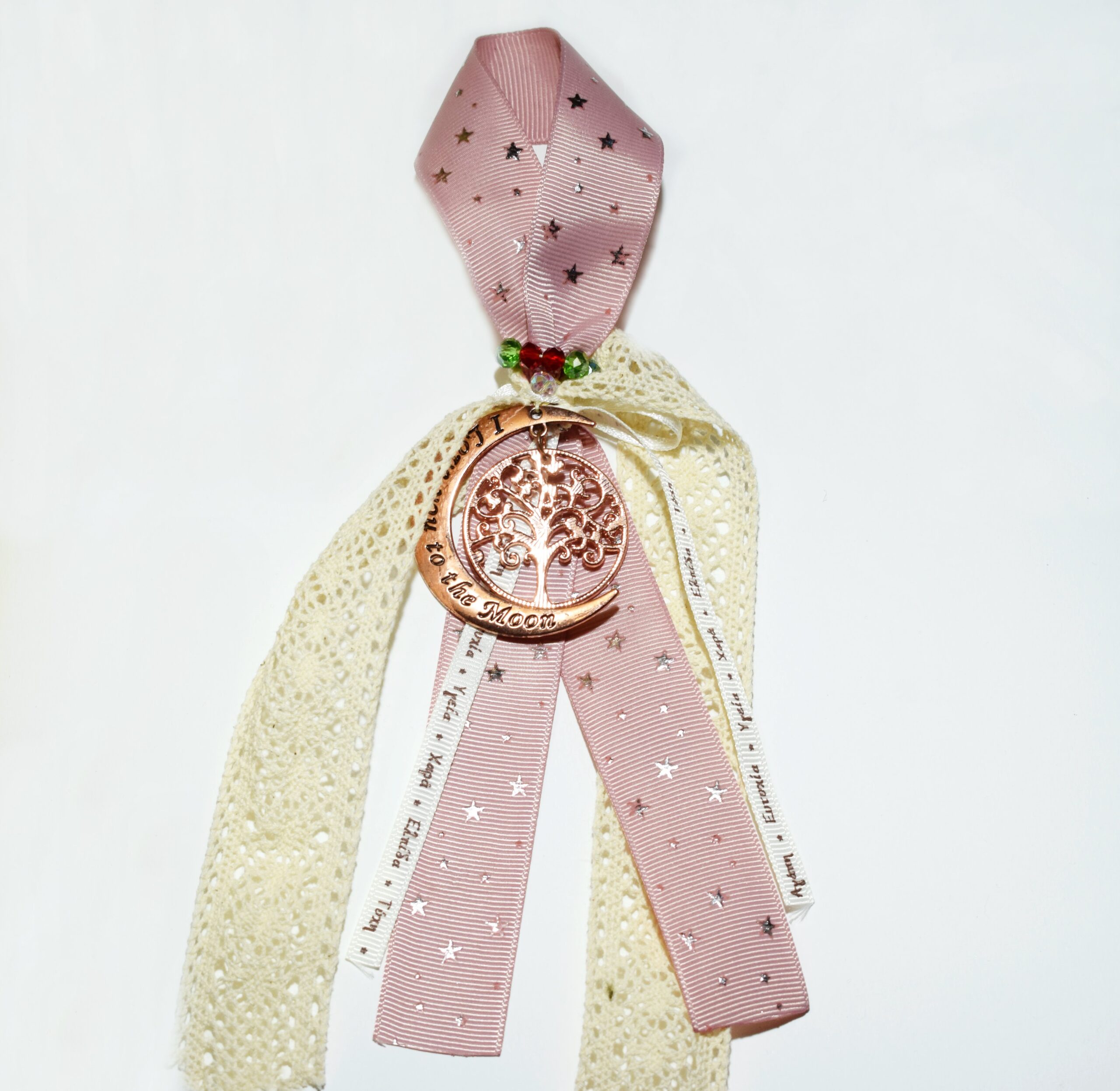 Ρομαντικό γούρι μισοφέγγαρο σε χρώμα ροζ χρυσό με το δέντρο ζωής δεμένο με όμορφη κορδέλα και δαντέλα.
