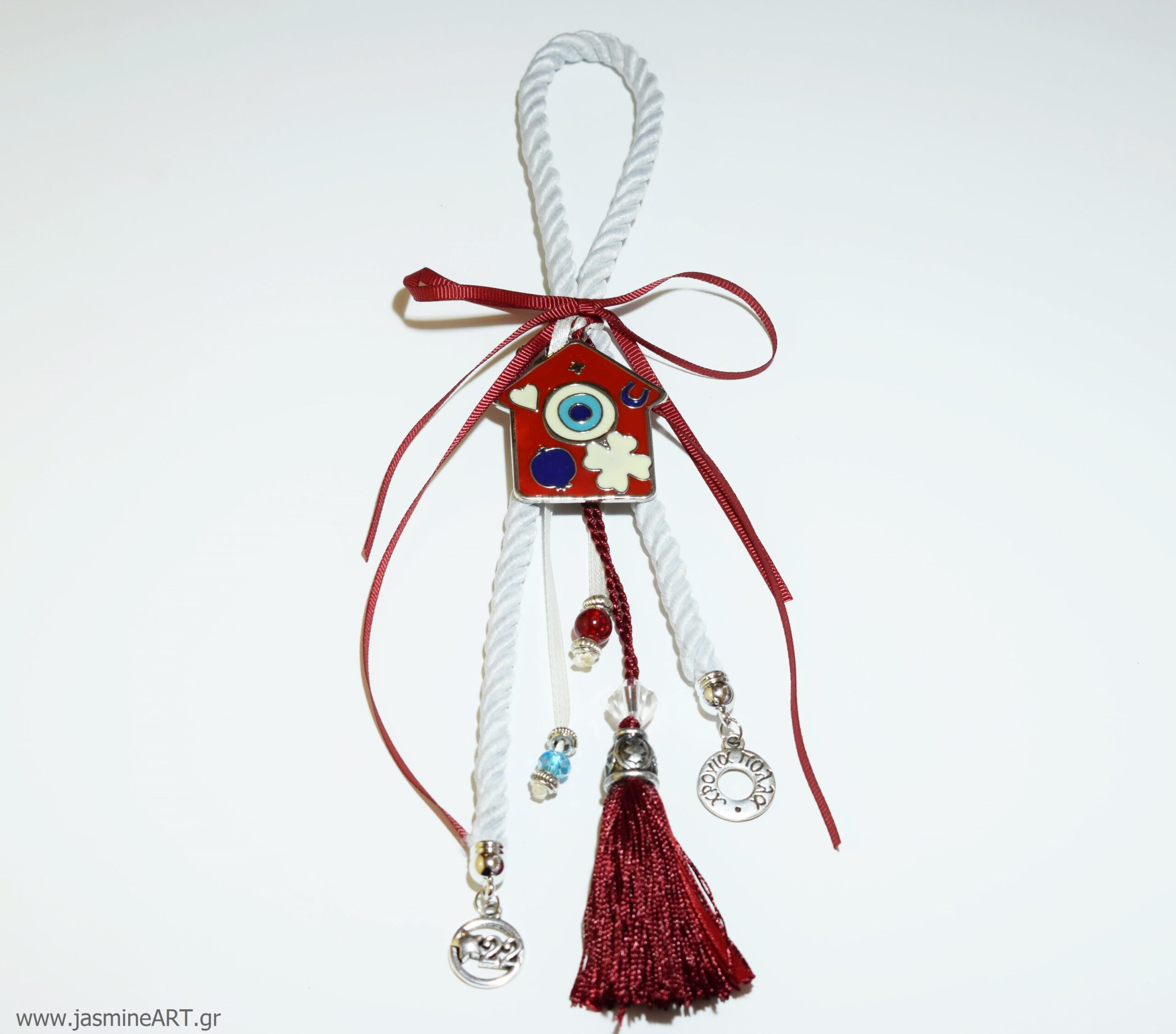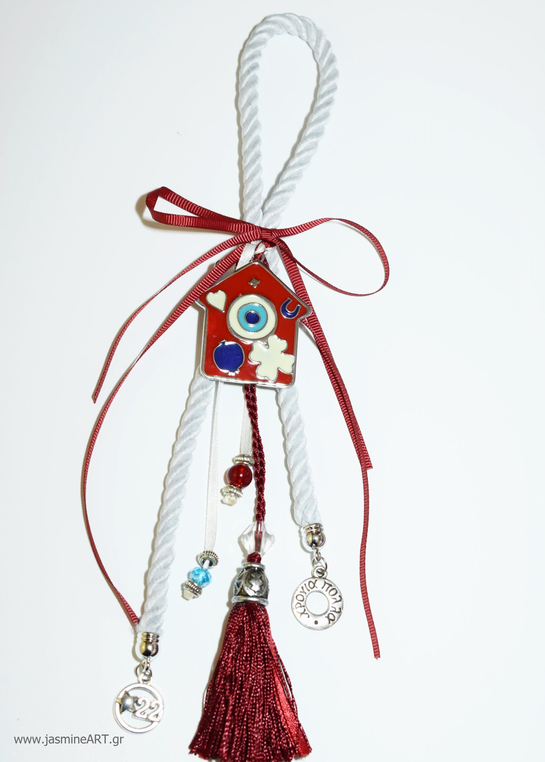 Όμορφο γούρι μεταλλικό σπιτάκι με σμάλτο, μάτι, φούντα και αλλά στοιχεία δεμένο σε λευκό κορδόνι.