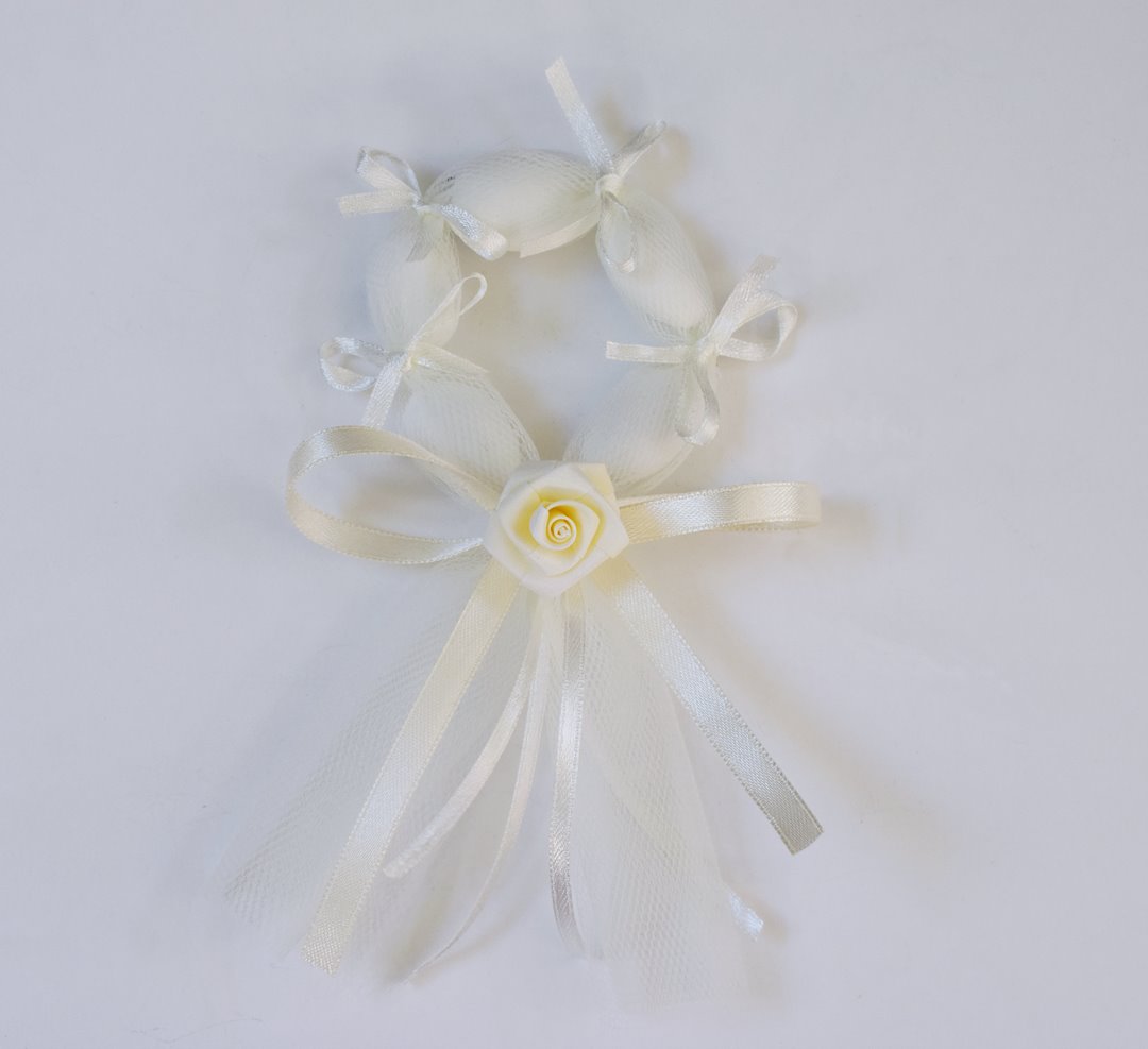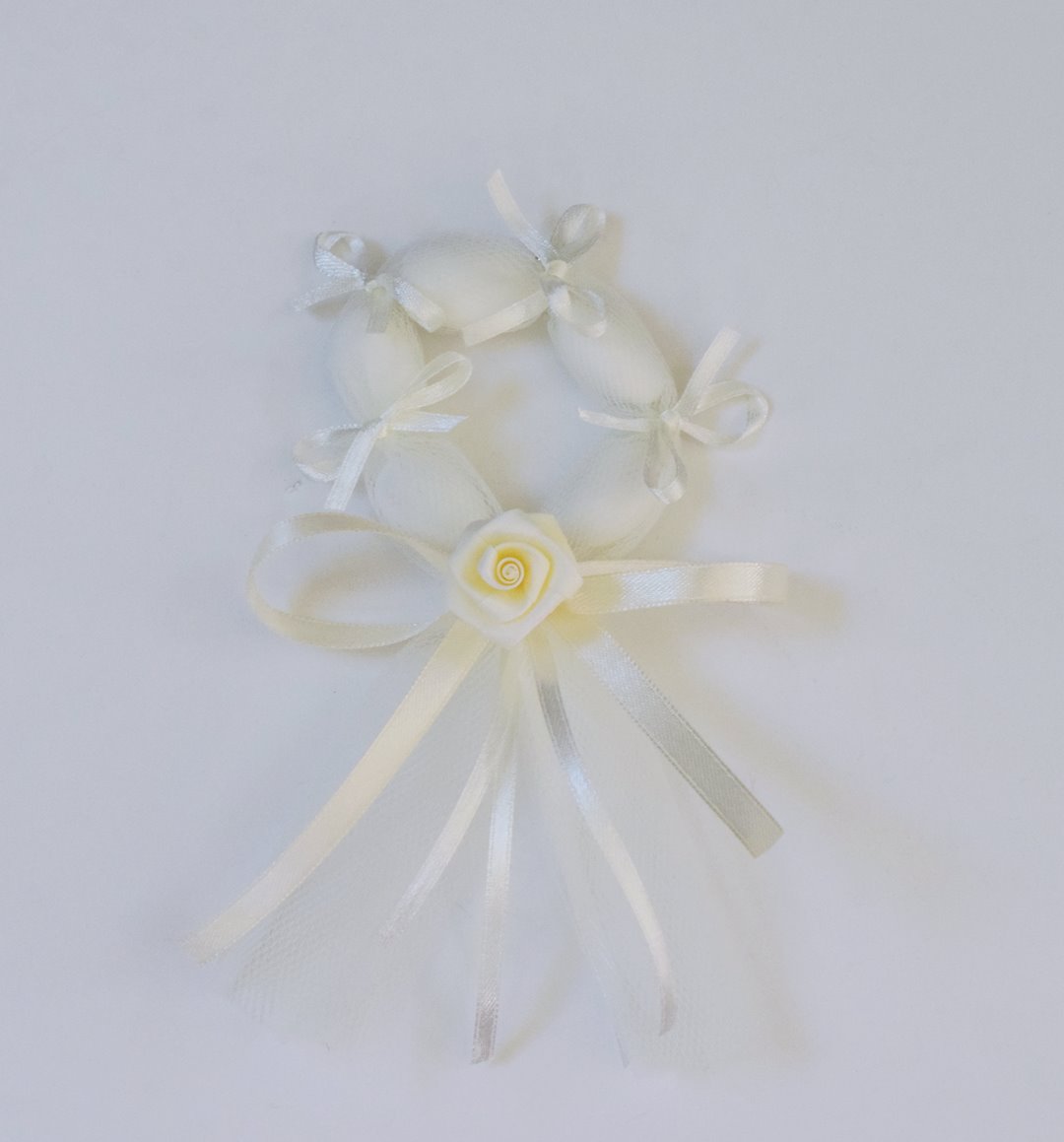 Οικονομική μπομπονιέρα γάμου και αρραβώνα , κουφετένιο στεφανάκι με ανθάκι σατέν φιογκάκια και 5 κουφέτα αμυγδάλου. Μπορεί να φτιαχτεί και σε χρώματα της επιλογή σας.