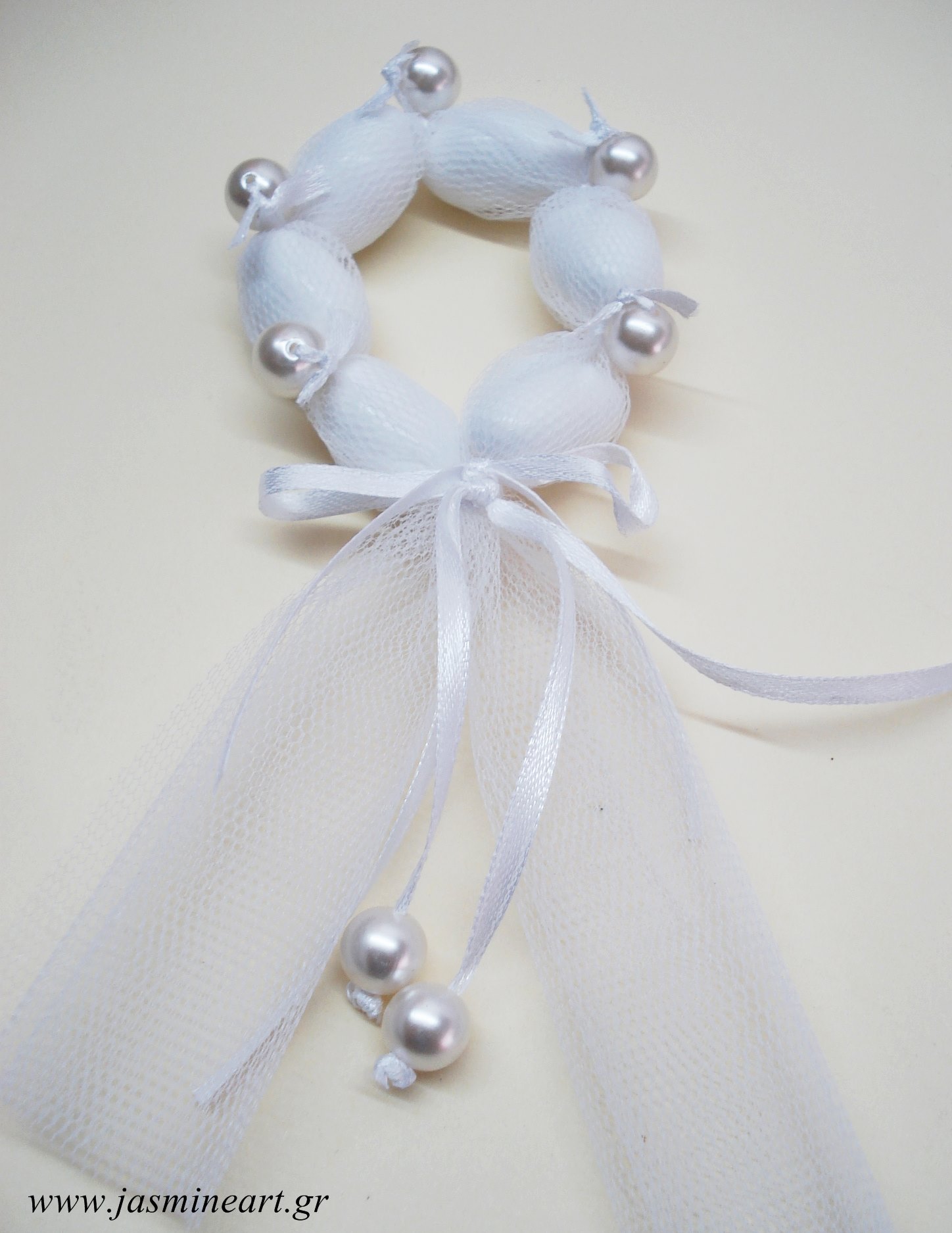 Μπομπονιέρα στεφανάκι με πέρλες με 5 κουφέτα, πέρλες και σατέν φιογκάκι.