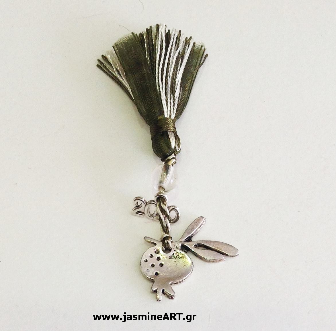 Οικονομικό γούρι με μεταλλικό στοιχείο ρόδι και φούντα.