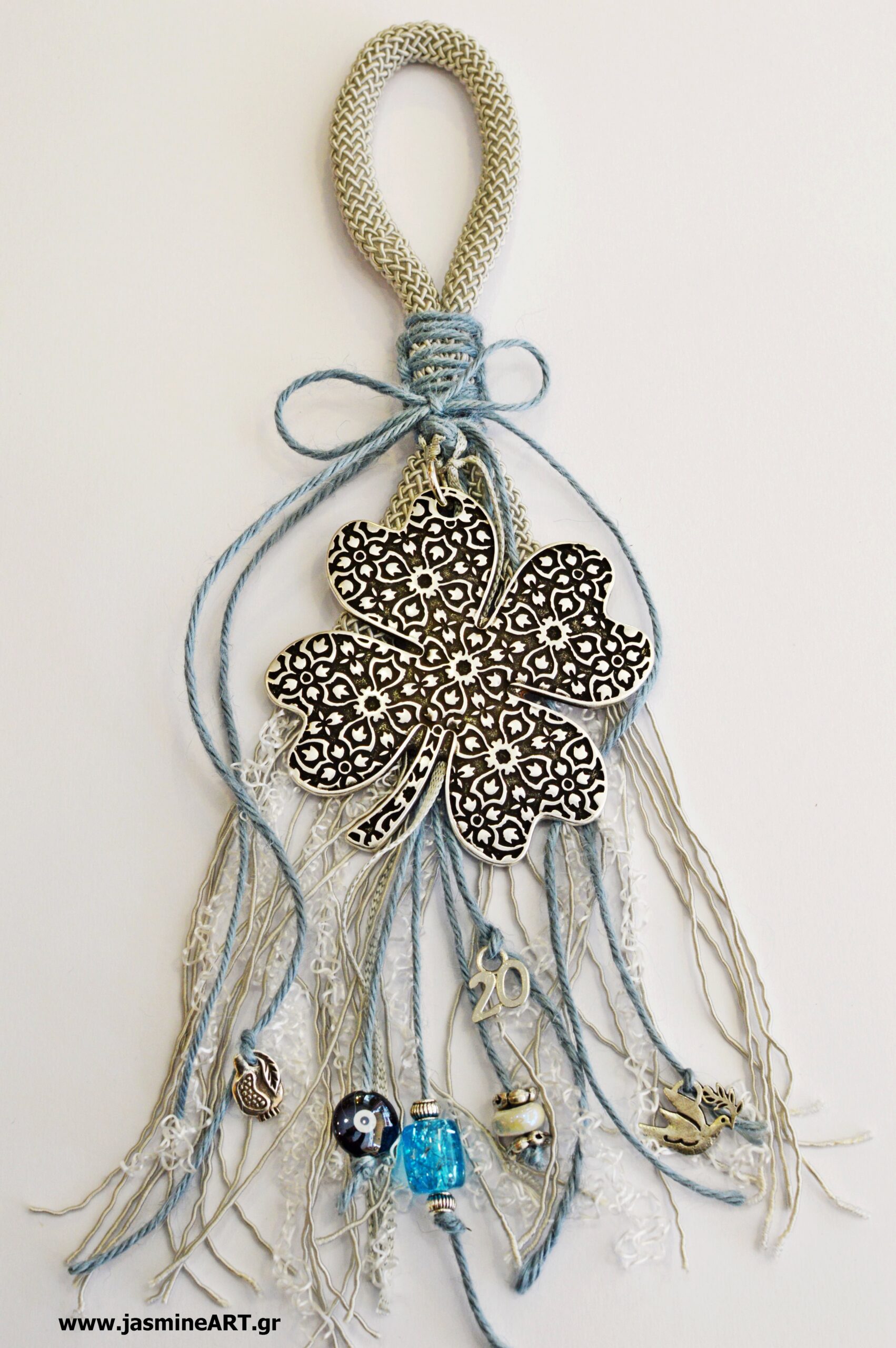 Χειροποίητο εντυπωσιακό βιντάζ γούρι με μεγάλο τετράφυλλο τριφύλλι, σύμβολο καλής τύχης.